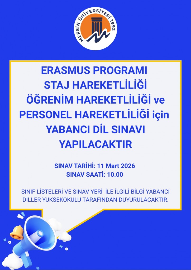 ERASMUS PROGRAMI STAJ HAREKETLİLİĞİÖĞRENİM HAREKETLİLİĞİ ve PERSONEL HAREKETLİLİĞİ için YABANCI DIL SINAVI YAPILACAKTIR.SINAV TARİHİ: 11 Mart 2026 SINAV SAATİ: 10.00 SINIF LİSTELERİ VE SINAV YERİ&