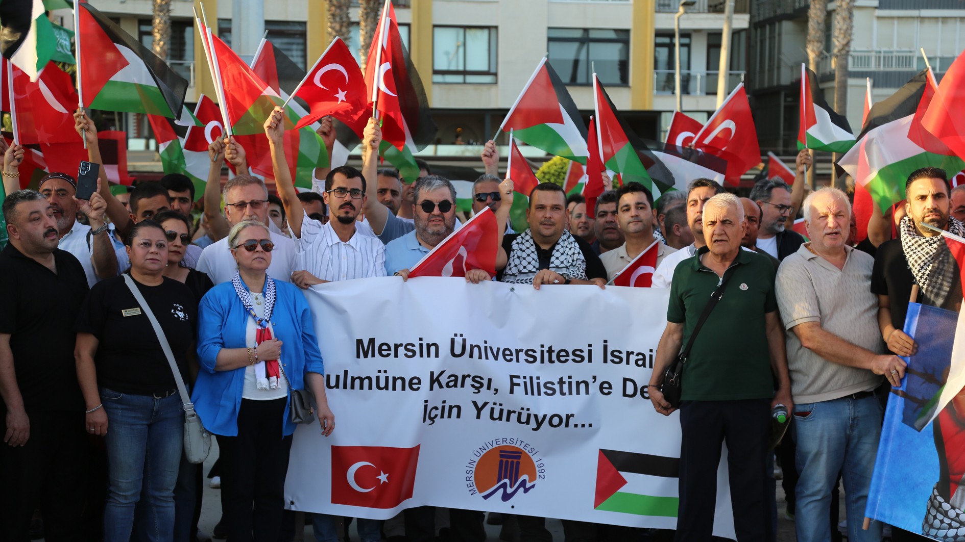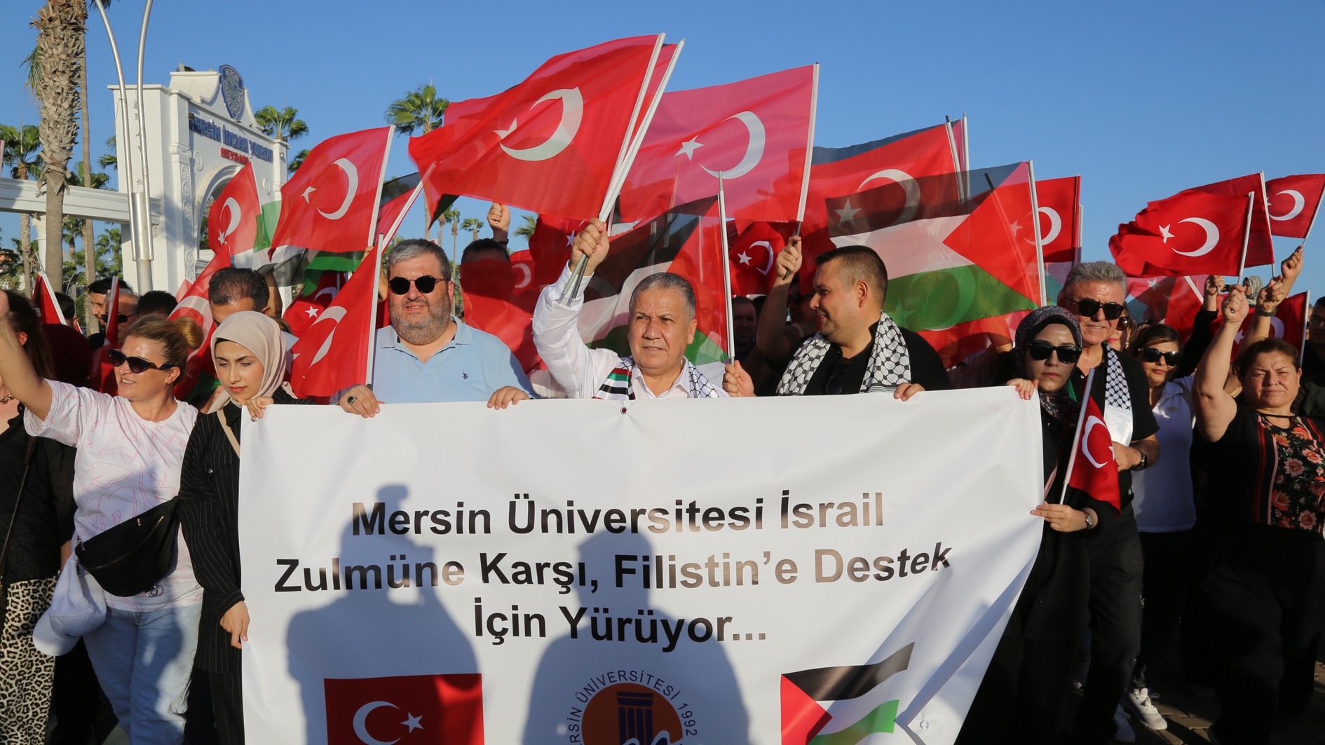 Mersin Üniversitesi Ailesi olarak Filistin halkının haklı mücadelesine ses olmak için düzenlenen yürüyüşe katıldıklarını belirten Rektörümüz Prof. Dr. Erol Yaşar, “İnanıyoruz ki bugün hem Mersin’de hem de Türkiye’nin dört bir yanında düzenlenen bu kararlılık yürüyüşlerinde yükselen ses, adaletin, insanlığın ve vicdanın sesi olacaktır. Bizler, Mersin Üniversitesi olarak zulmün karşısında, mazlumun yanında olmayı bir insanlık görevi olarak görüyoruz. Dileğimiz; tüm dünyanın, Filistin halkının yaşadığı bu büyük acıya kayıtsız kalmaması, uluslararası hukukun ve insan haklarının bir an önce tesis edilmesidir. Bu duygu ve düşüncelerle Gazze’de yaşanan dramın son bulduğu, barışın ve adaletin hâkim olduğu bir dünya umuduyla mücadelemizi sürdüreceğimizi ifade ediyor, Filistin halkının her zaman yanında olduğumuz belirtmek istiyorum.” dedi.