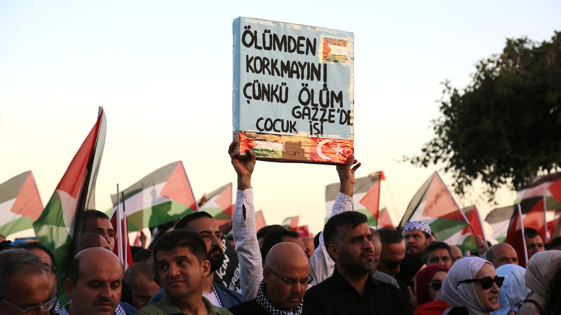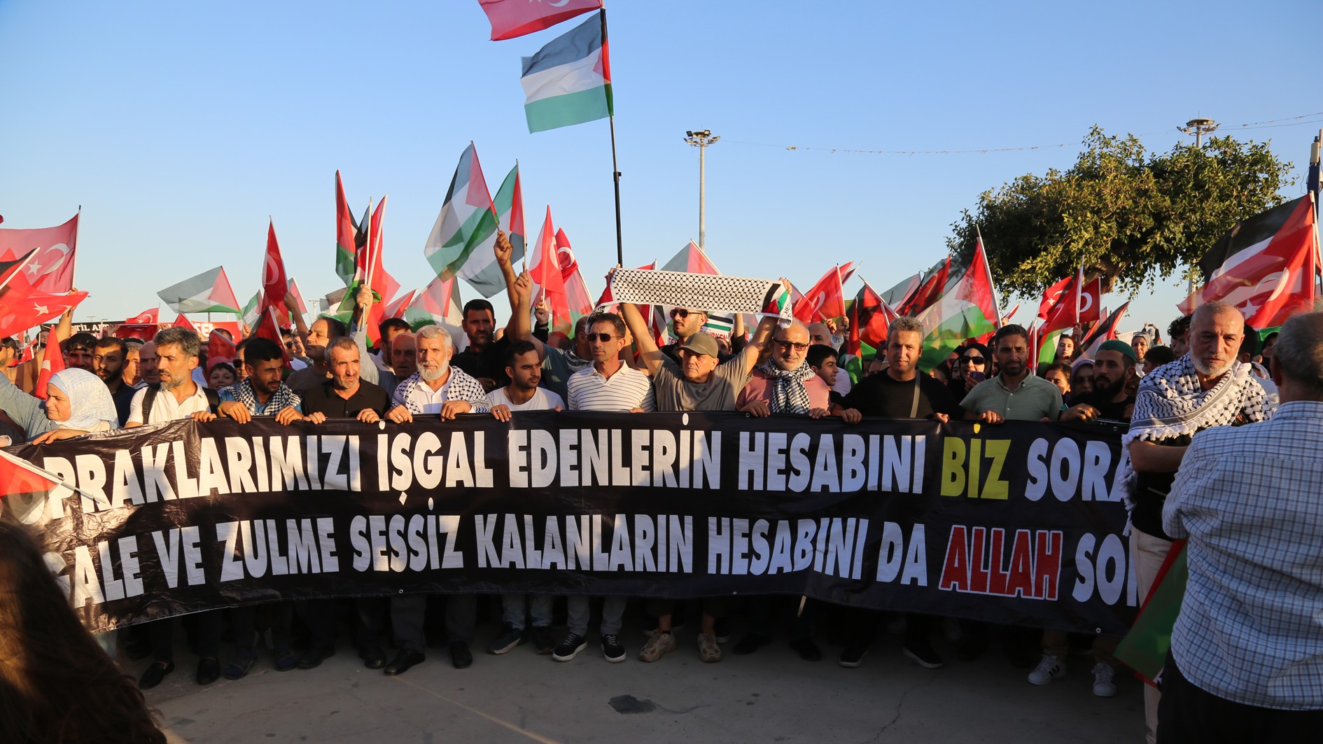 Yürüyüşte alanı dolduran binlerce katılımcı İsrail'in Gazze'de 7 Ekim 2023'ten bu yana devam eden soykırımı ve Filistin'de yaşanan insanlık dramına dikkati çekmek amacıyla sloganlar attı.