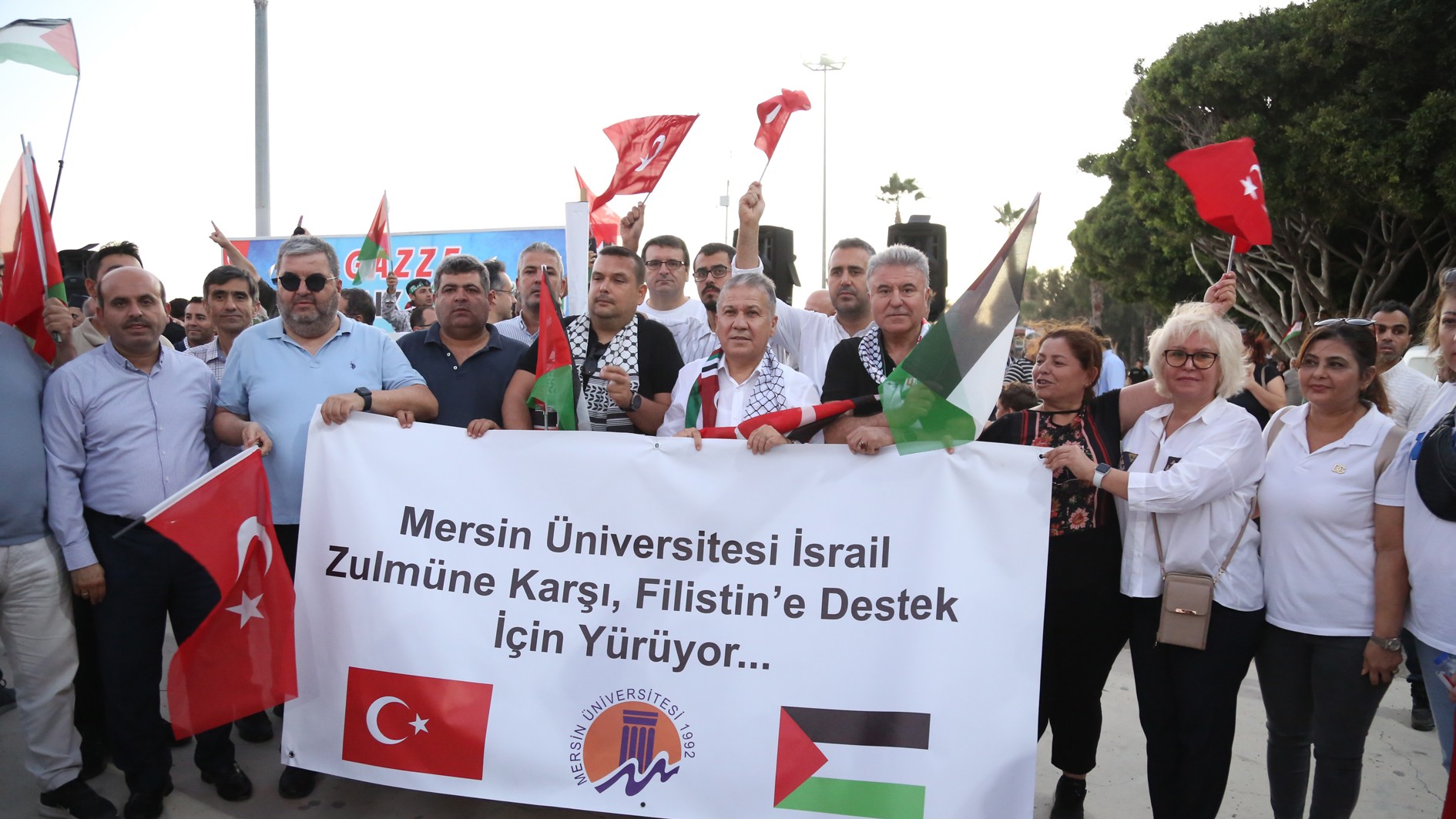 5 Ekim Pazar günü Mersin İdman Yurdu Meydanı’ndan başlayarak Özgecan Aslan Barış Meydanı’nda sona eren yürüyüşe, Rektörümüz Prof. Dr. Erol Yaşar öncülüğündeki akademik ve idari personelimiz ile öğrencilerimiz “Mersin Üniversitesi İsrail Zulmüne Karşı, Filistin’e Destek İçin Yürüyor” pankartını açarak yoğun bir katılım gösterdi.