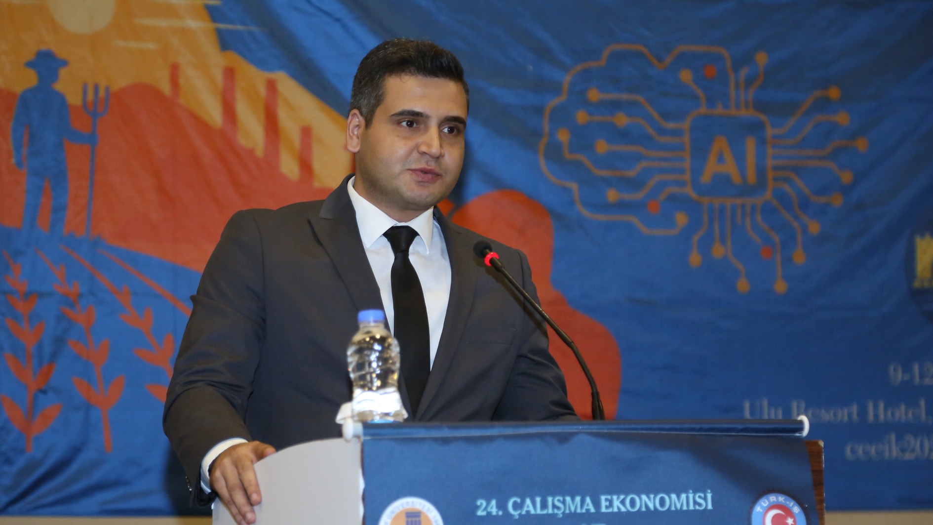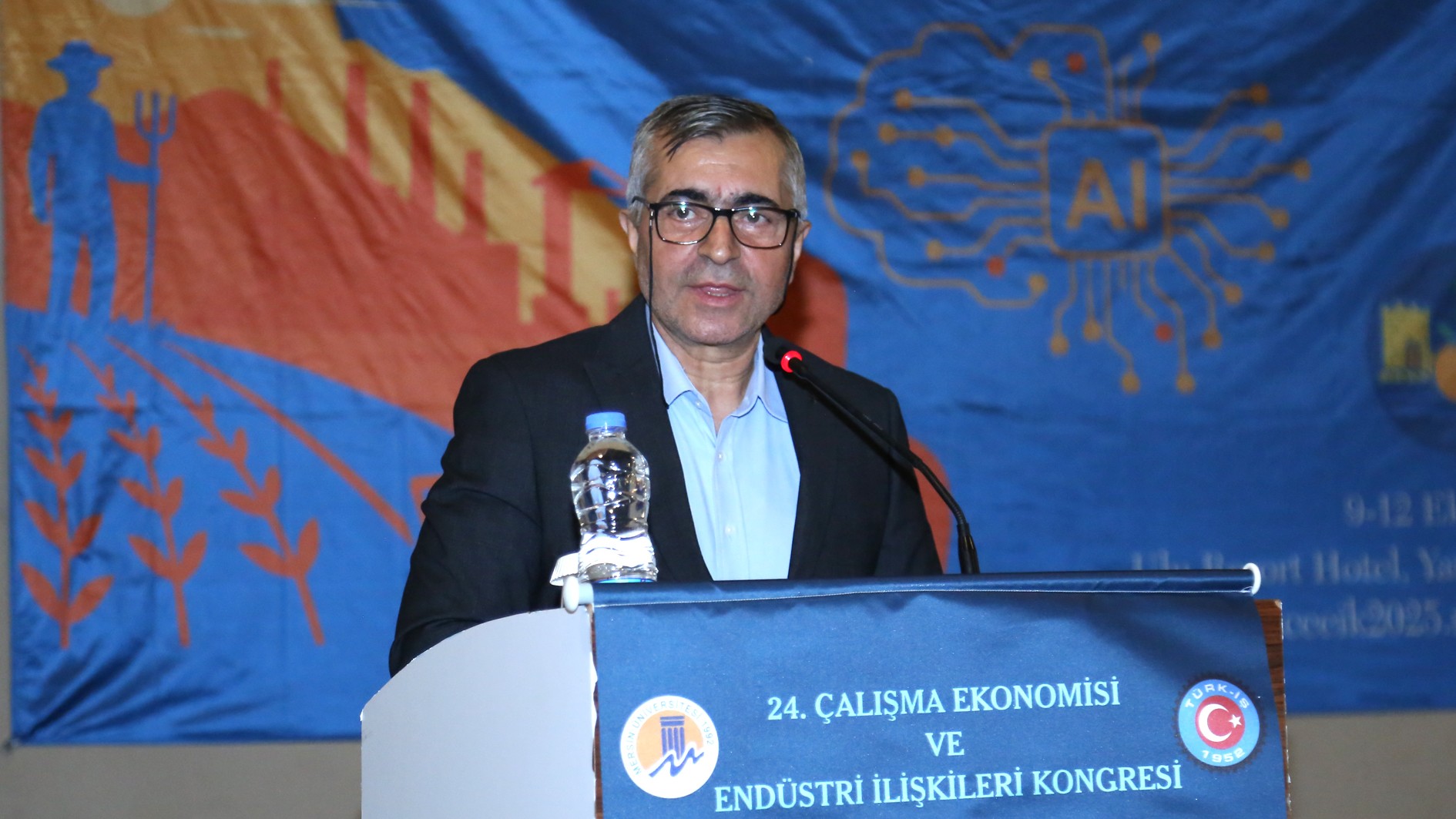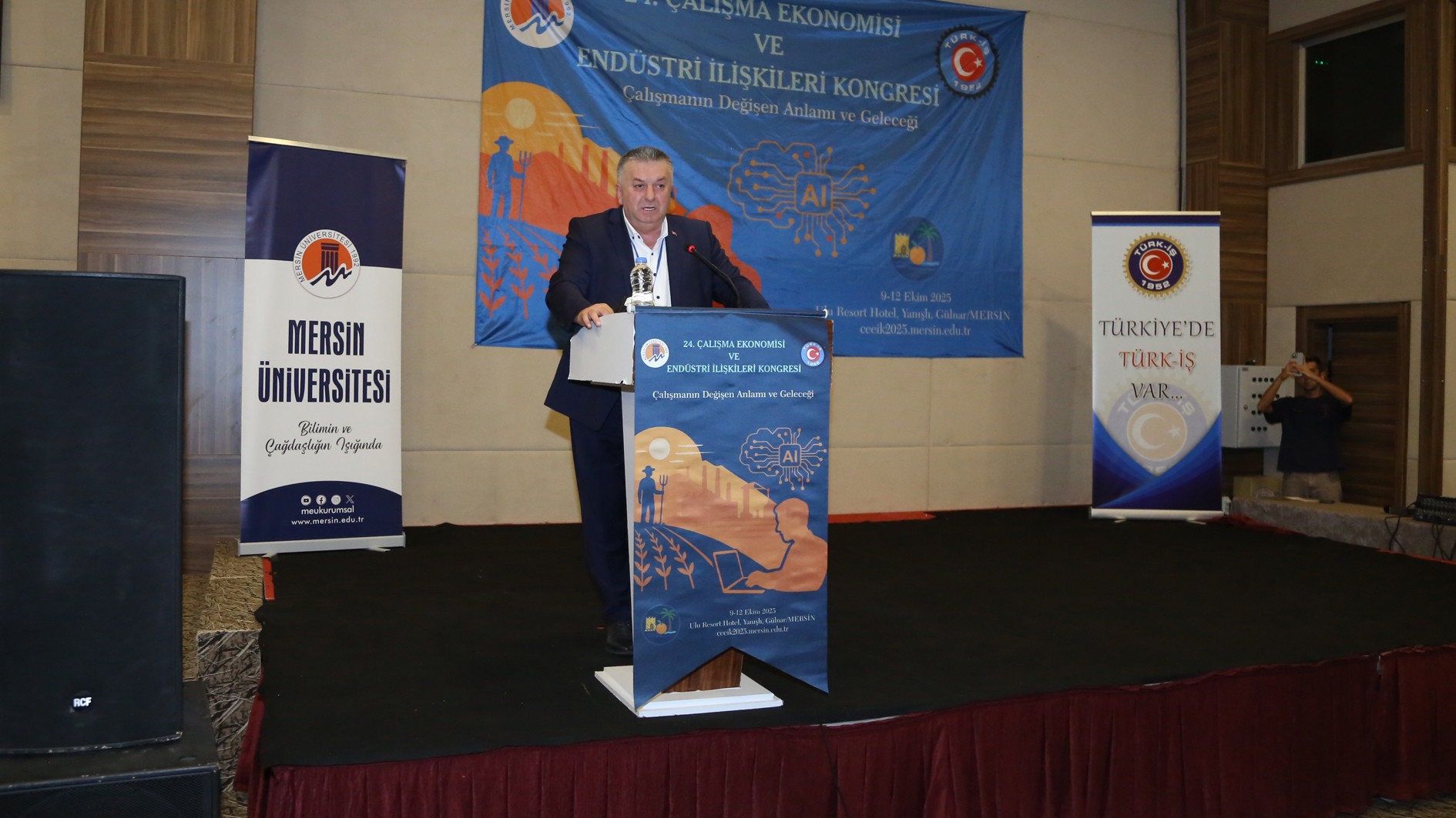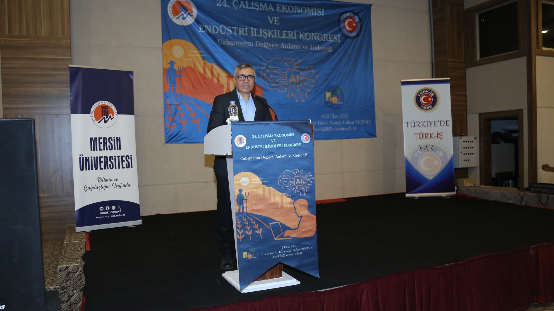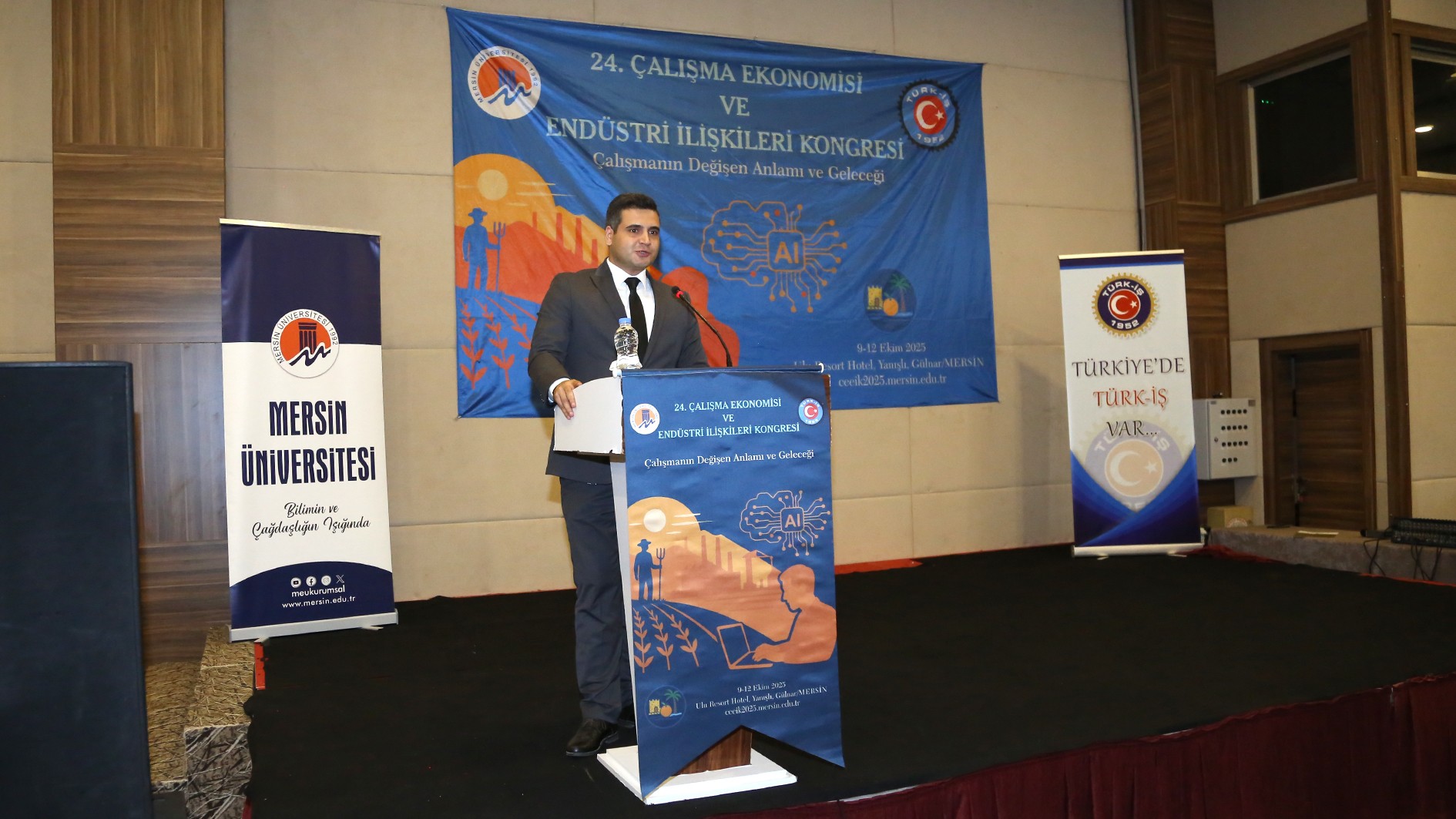 TÜRK-İŞ Konfederasyonu Genel Başkan Yardımcısı İrfan Kabaloğlu konuşmasında “TÜRK-İŞ, bugüne kadar her yıl olduğu gibi, kongremizin düzenlenmesine büyük önem vermiştir. Çalışma Ekonomisi ve Endüstri İlişkileri Kongreleri, yalnızca akademik bir buluşma olmanın ötesinde, işçi sınıfının hakları, çalışma yaşamı ve sosyal adalet gibi kritik konularda önemli tartışmaların yapıldığı platformlardır. Her yıl siz değerli akademisyenlerle bir araya gelmek, birbirimizi dinlemek, sorunlarımızı paylaşmak ve çözüm yolları aramak bizler için çok kıymetlidir. TÜRK-İŞ olarak, kurulduğumuz günden bu yana akademik dünyadan aldığımız destekle, çalışma hayatına dair büyük bir sorumluluk taşıyoruz. Bu kongre, sendikacılıkla ilgili yaklaşımlarımızı geliştirmeye ve işçi hakları konusundaki bilgimizi derinleştirmeye olan katkıları dolayısıyla oldukça önemlidir. Bugün burada, yalnızca çalışma hayatının değişen dinamiklerini değil, bu değişimin işçi sınıfı ve toplum üzerindeki etkilerini de tartışmak için toplandık.” ifadelerine yer verdi.