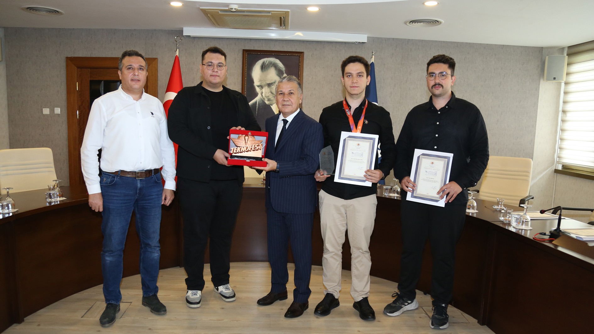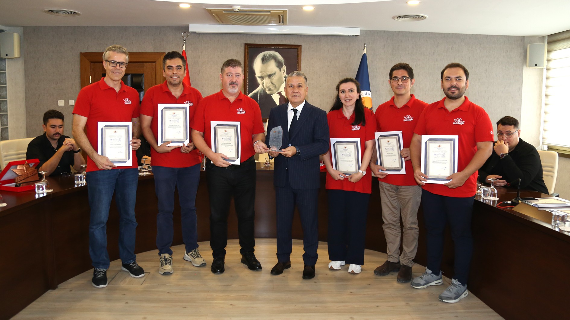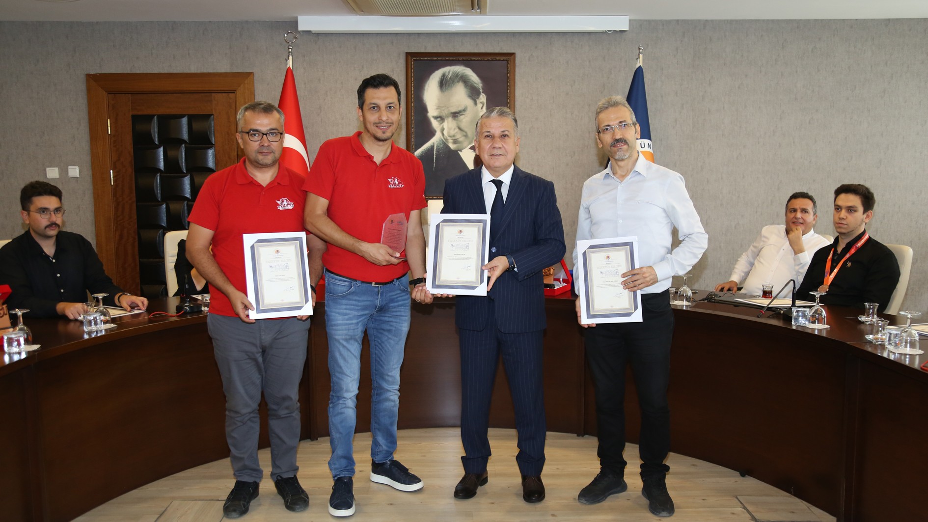 Törenin ikinci bölümünde, TEKNOFEST 2025 İstanbul ve KKTC organizasyonlarında Üniversitemizi temsil eden takımlarımızla bir araya gelen Rektörümüz Prof. Dr. Erol Yaşar, takım kaptanlarına plaket, takım üyelerine ise teşekkür belgeleri takdim etti.