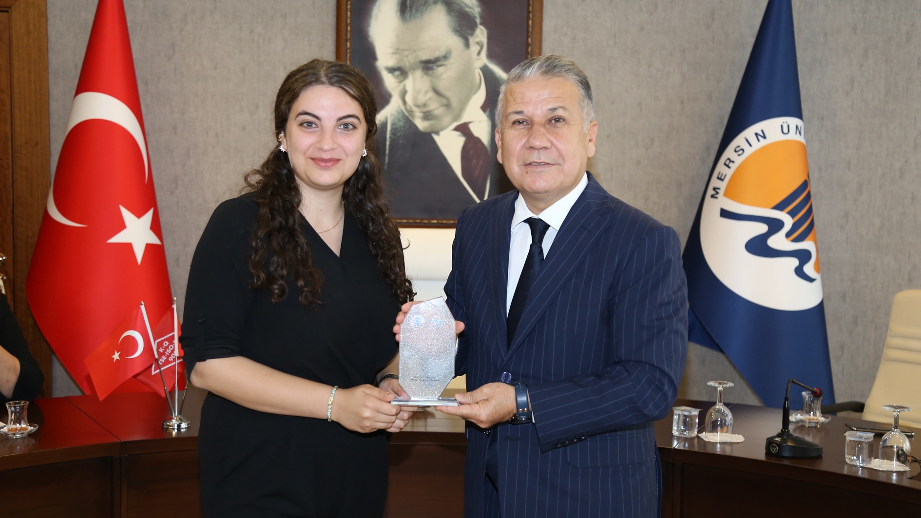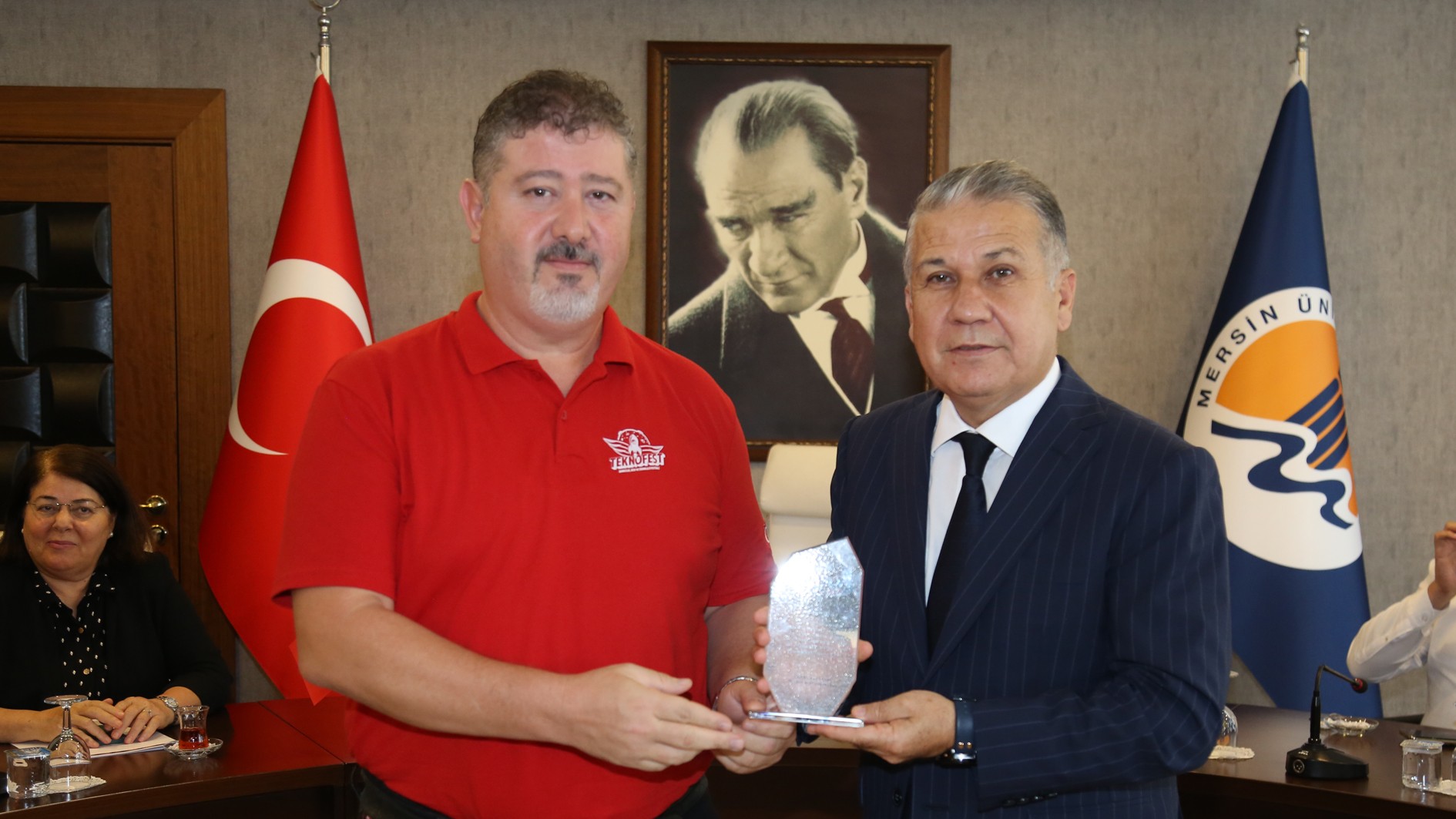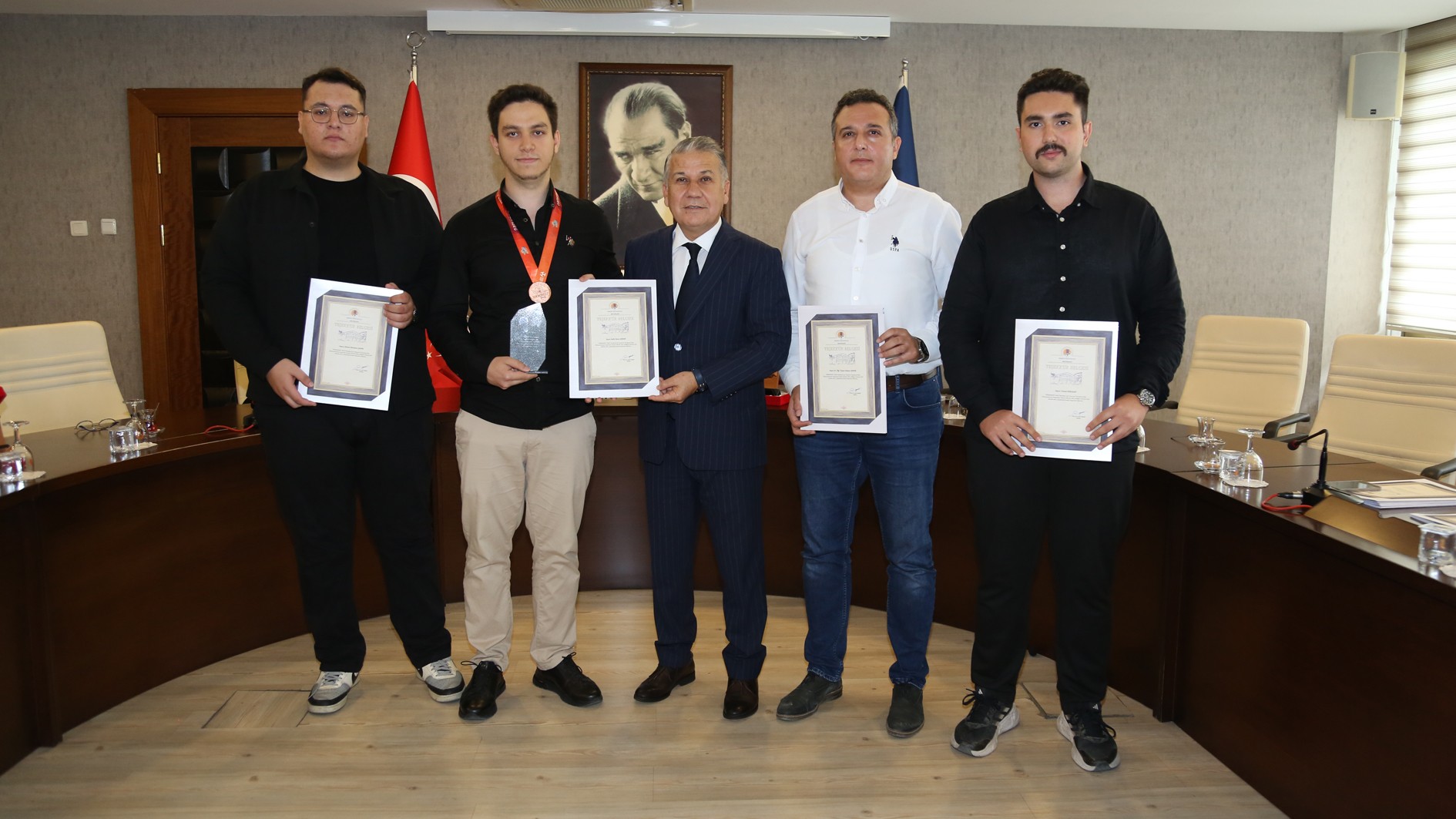 Törenin ikinci bölümünde, TEKNOFEST 2025 İstanbul ve KKTC organizasyonlarında Üniversitemizi temsil eden takımlarımızla bir araya gelen Rektörümüz Prof. Dr. Erol Yaşar, takım kaptanlarına plaket, takım üyelerine ise teşekkür belgeleri takdim etti.
