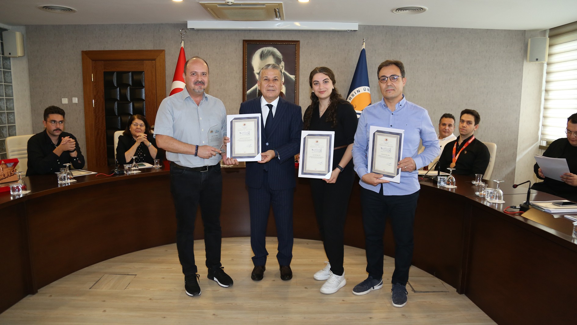 Konuşmaların ardından, TÜBİTAK 2209 projeleri kapsamında başarılı olan akademik birim temsilcilerine teşekkür belgeleri Rektörümüz Prof. Dr. Erol Yaşar tarafından takdim edildi.