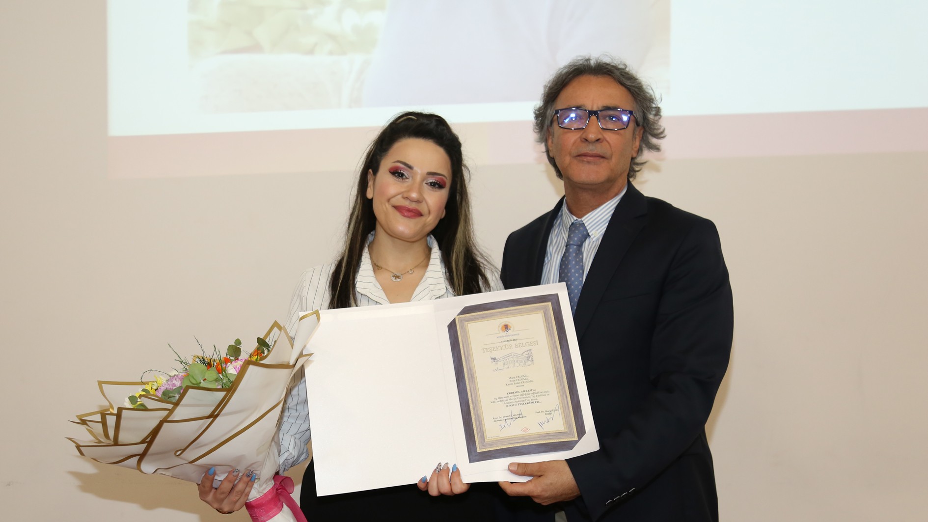 “Tıbbın Sessiz Öğreticilerine Teşekkür Töreni”ne kadavralar hakkındaki duygu ve düşüncelerini içeren yazısıyla katkı sağlayan Tıp Fakültesi Dönem 3 öğrencisi Raul Alakbarli’ye ise Tıp Fakültesi Dekanı Prof. Dr. Murat Ünal tarafından teşekkür belgesi sunuldu.